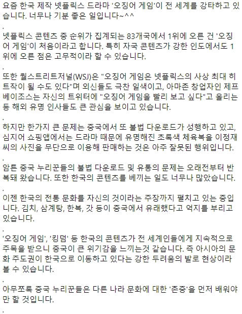 현재 넷플릭스에서 가장 인기 있는 '오징어 게임'을 중국에서 불법 유통하고 있다며 "존중을 먼저 배워라"라고 비판했습니다.